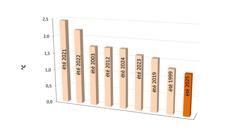 Die minimale Temperatur im Sommer 2025 erreichte 22,3 °C und lag damit 1,2°C über dem Normalwert (21,1 °C).